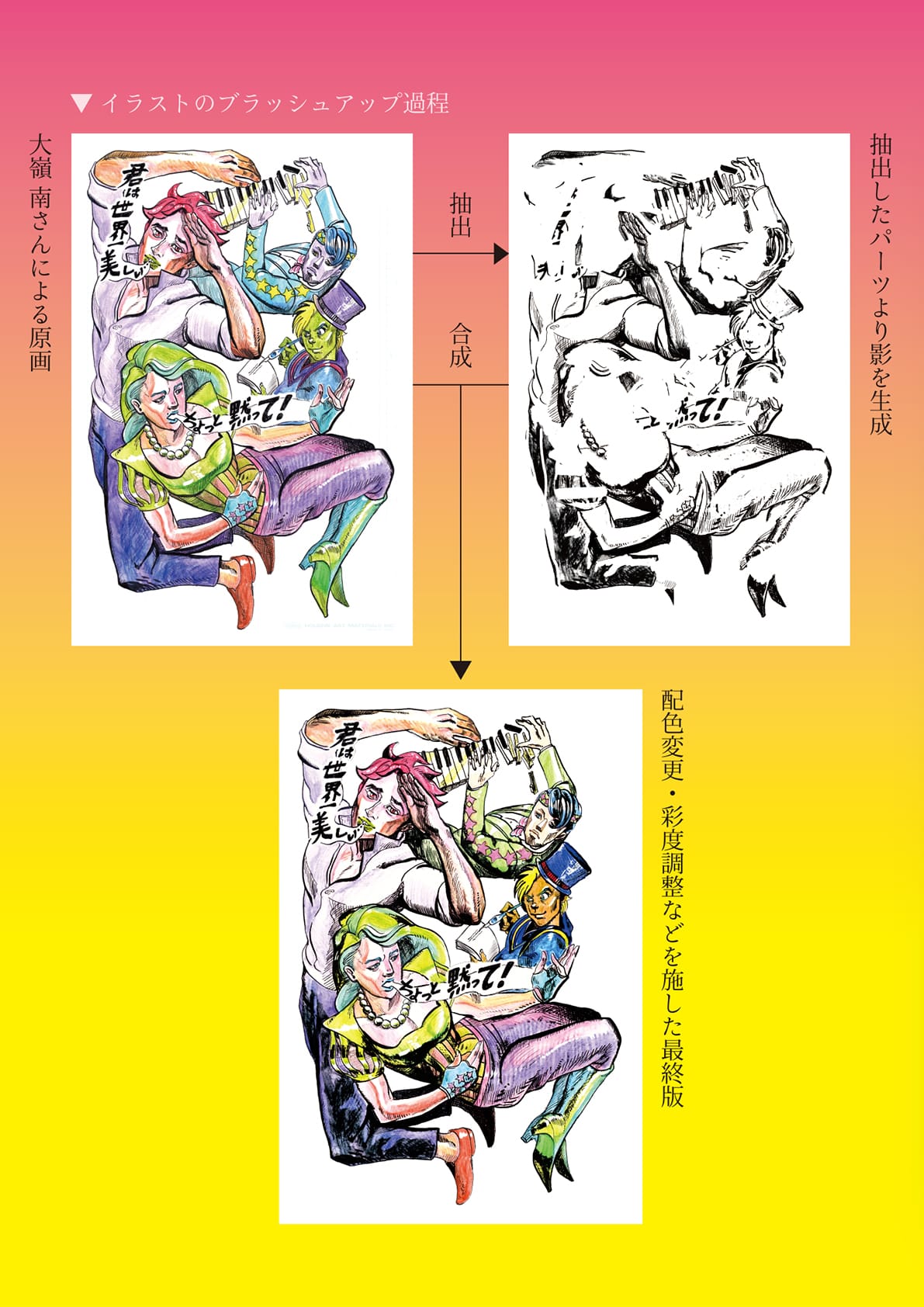 - Not just the illustration, but the title typography, layout, and color scheme were all carefully crafted to evoke the distinctive visual world of JoJo.