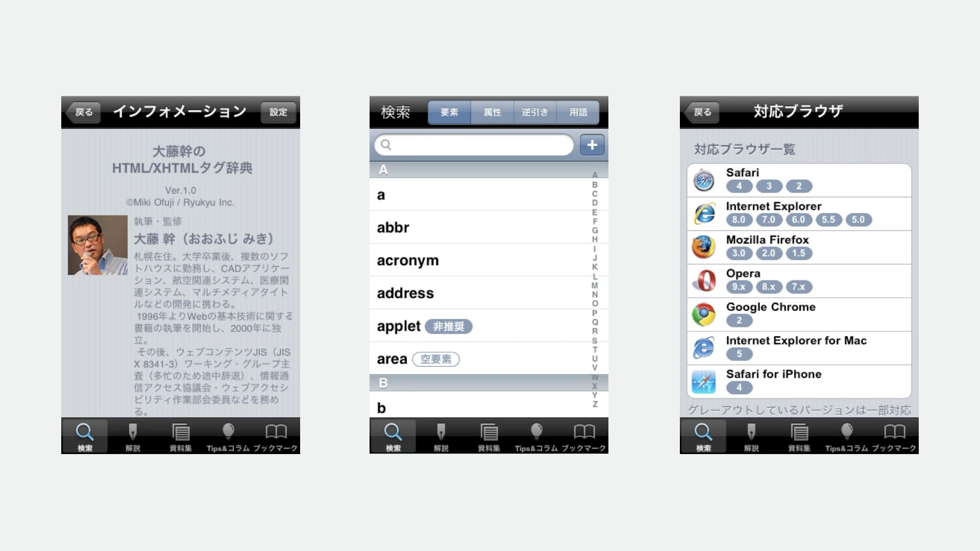 An HTML/XHTML Tag Dictionary (iPhone app) written and supervised by Miki Ofuji, a highly trusted engineer, author, and instructor in Japan’s web development industry.